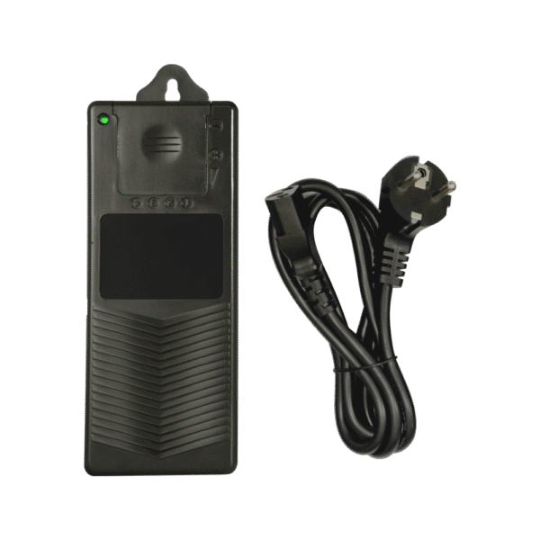 De adapter heeft een bevestigingsoog voor nette montage, en is beveiligd tegen kortsluiting en overbelasting. De uitgangsspanning is instelbaar.