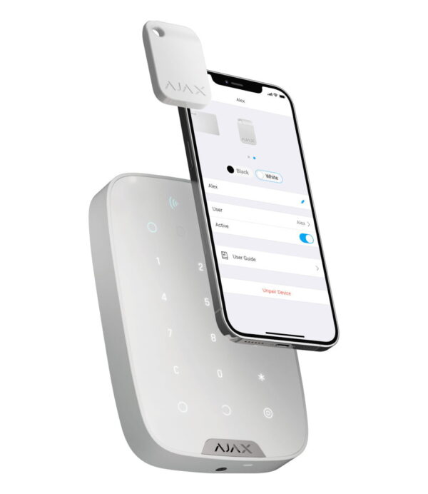 Encrypted Metal Tag te gebruiken voor de Keypad Plus. Om het beveiligingssysteem in- of uit te schakelen hoeft de gebruiker alleen de Tag aan het bediendeel te presenteren. Met de Metal Tag kun je elke beveiligingsmodus gebruiken zonder code, gebruikersaccount of toegang tot de Ajax-app.