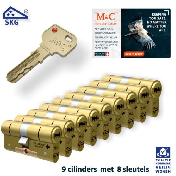 M&C CONDOR is het vlaggenschip van M&C. De Condor cilinder is beveiligd tegen boren, openpikken, kerntrekken, de slagmethode en de impressietechniek. Deze veiligheidscilinder heeft bovenop de drie sterren SKG vereisten ook nog een hardstalen brug waardoor deze nagenoeg onbreekbaar is – zelfs zonder deurbeslag!