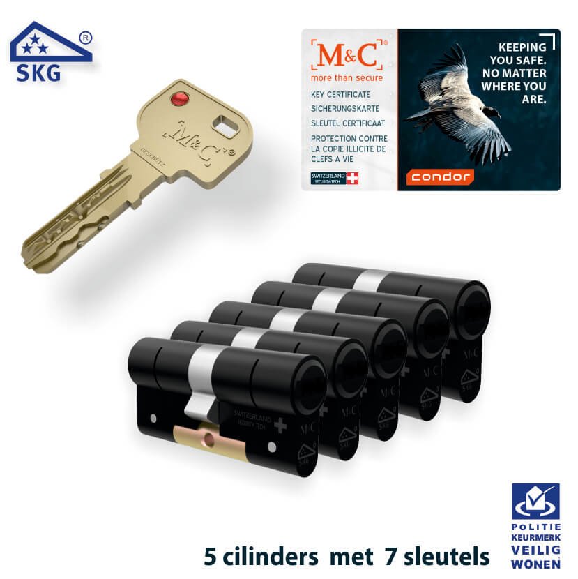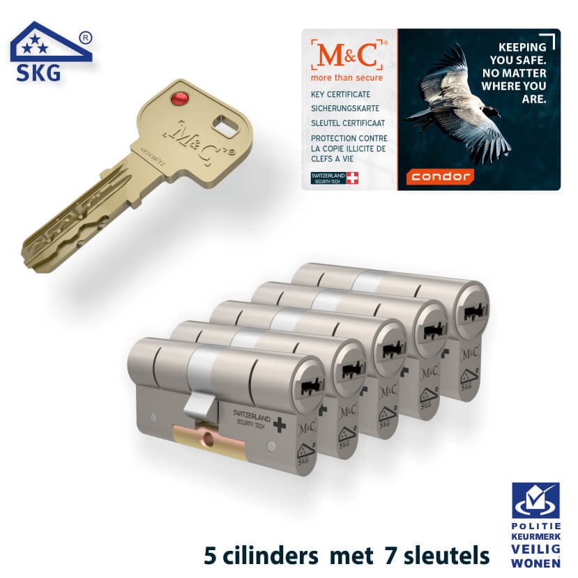 M&C CONDOR is het vlaggenschip van M&C. De Condor cilinder is beveiligd tegen boren, openpikken, kerntrekken, de slagmethode en de impressietechniek. Deze veiligheidscilinder heeft bovenop de drie sterren SKG vereisten ook nog een hardstalen brug waardoor deze nagenoeg onbreekbaar is – zelfs zonder deurbeslag!