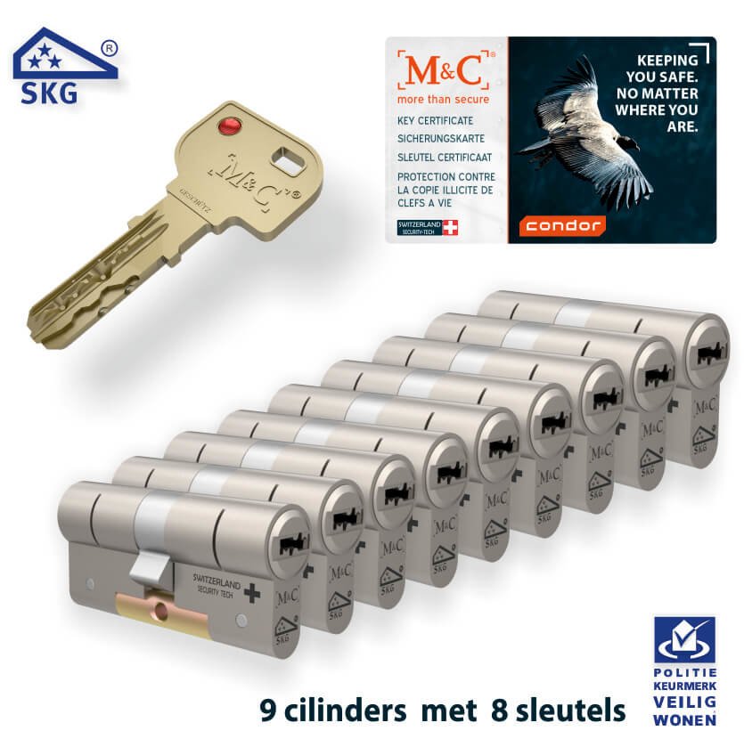 M&C CONDOR is het vlaggenschip van M&C. De Condor cilinder is beveiligd tegen boren, openpikken, kerntrekken, de slagmethode en de impressietechniek. Deze veiligheidscilinder heeft bovenop de drie sterren SKG vereisten ook nog een hardstalen brug waardoor deze nagenoeg onbreekbaar is – zelfs zonder deurbeslag!